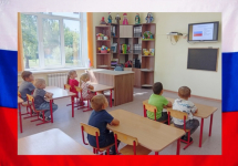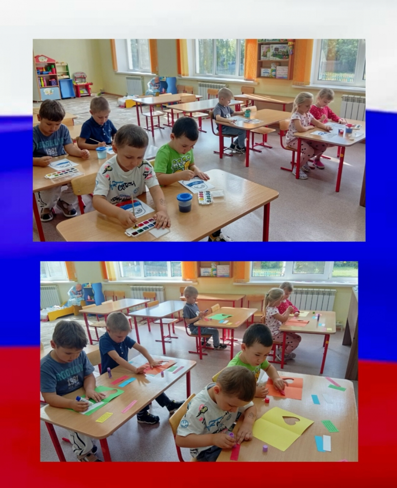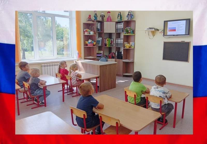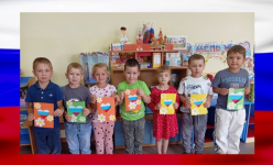 В детских ручках — маленький флажок. Он горит, как огонек! Пусть живет и здравствует в веках Бело-сине-красный русский флаг!
